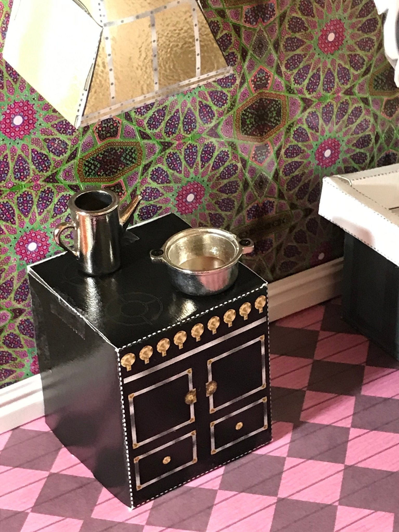 This 2 piece printable Victorian Cottage kitchen set is custom designed just for the Ooh...Sparkles! Dollhouse family. Includes 1 vintage stove and brass look range hood. These pieces are scaled to the 1:12 size and work great BOTH in traditional wood dollhouses AND paper models. This exclusive selection will give you a jump start on decorating the dollhouse of your dreams. Get your Shabby Chic decor DONE in a snap. Grab yours now!