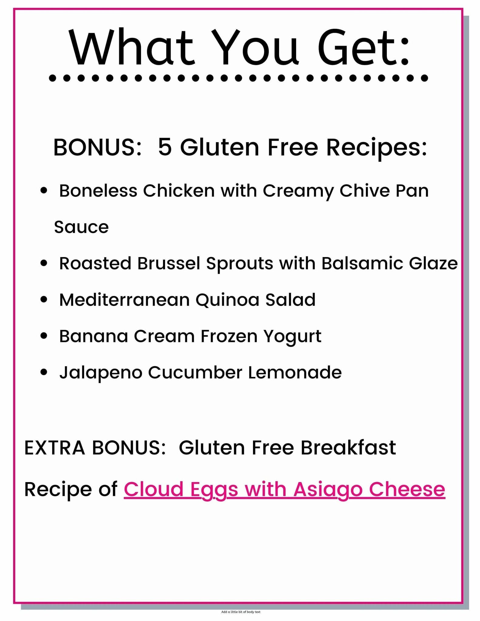 BONUS: 5 Gluten Free Recipes: Boneless Chicken with Creamy Chive Pan Sauce, Roasted Brussel Sprouts with Balsamic Glaze, Mediterranean Quinoa Salad, Banana Cream Frozen Yogurt, & Jalapeno Cucumber Lemonade